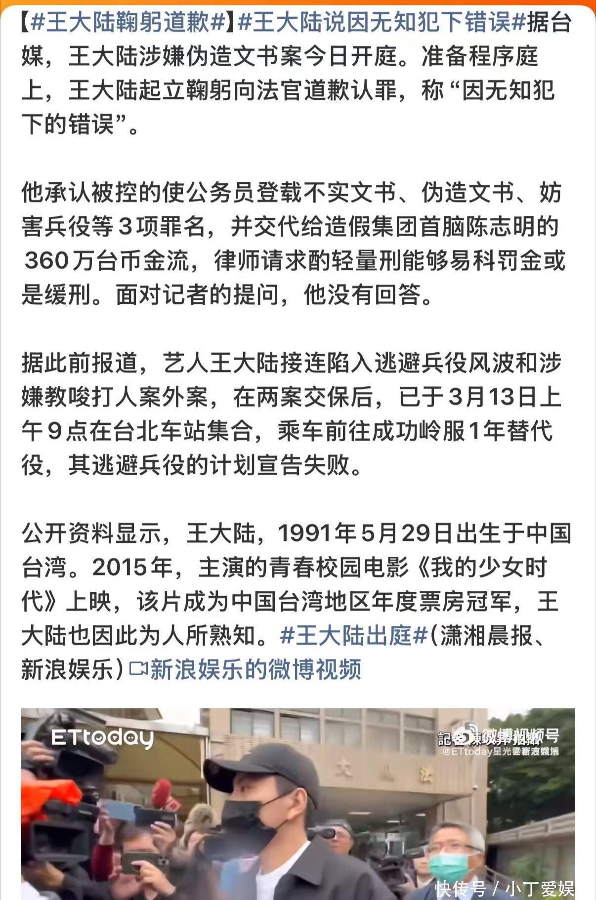 王大陆当庭认罪王大陆曾因《我的少女时代》走红,但他今年2月,王大陆被查出“伪造诊断证明”躲掉服兵役的义务。