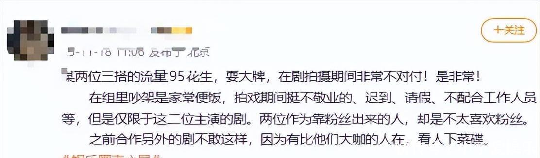 流量明星耍大牌11月18日,有网友爆料“某两位三搭的流量95花、小生,耍大牌”。